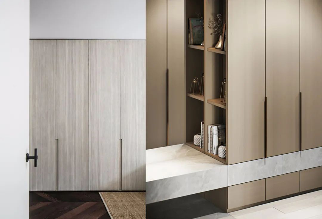 超高柜門在室內設計領域的應用非常廣泛,常用于玄關入戶區域的鞋柜,餐廳的餐邊柜,客廳電視背景墻的收納柜,臥室衣帽間的衣柜和廚房櫥柜,陽臺的收納柜都可以采用超高柜門的形式,根據每個空間的特性需求,來合理的配置柜體內部的收納區域。