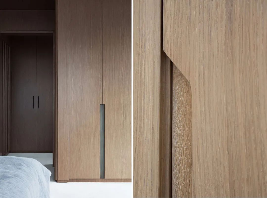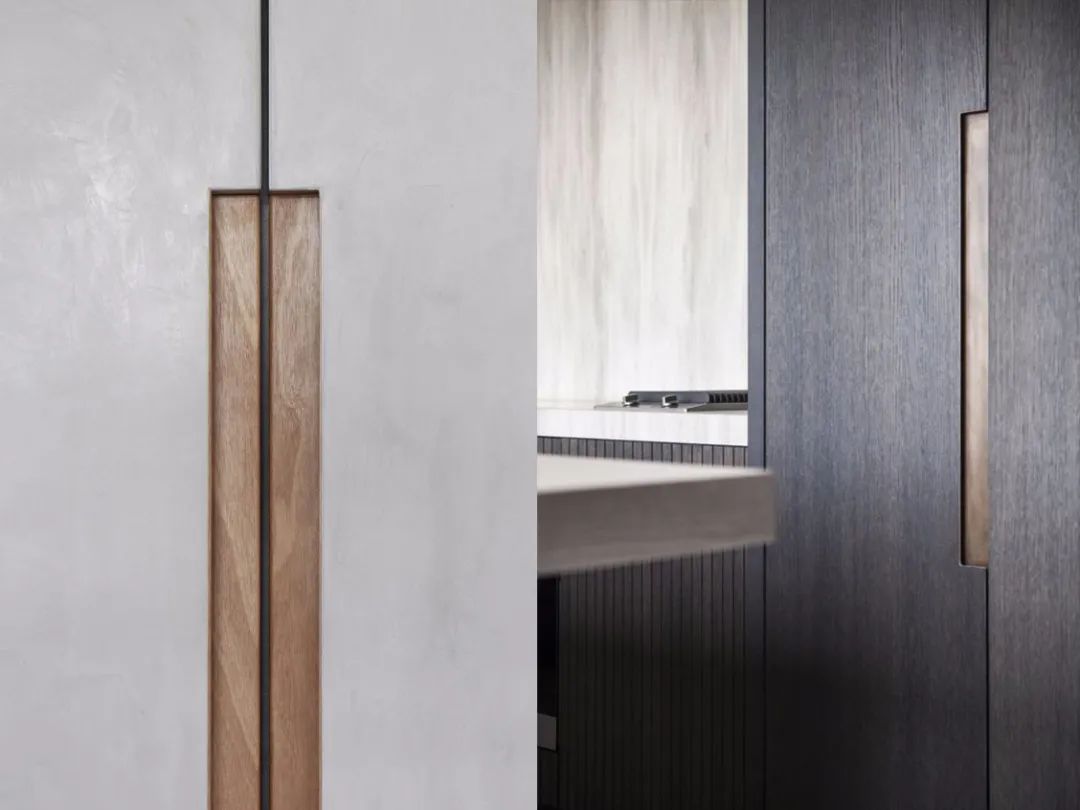 垂拔挺立的超高柜門,除去了把手的多余突兀感,讓整個柜門看上去并不會單調乏味,上下連貫垂拔,左右連續的超高柜門形成的多層次塊面讓空間的整體性更強。
