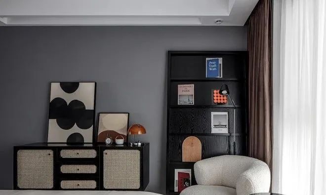 色調均勻的色塊、抽象的藝術繪畫、復古藤編邊柜、羊毛絨單椅裝點空間